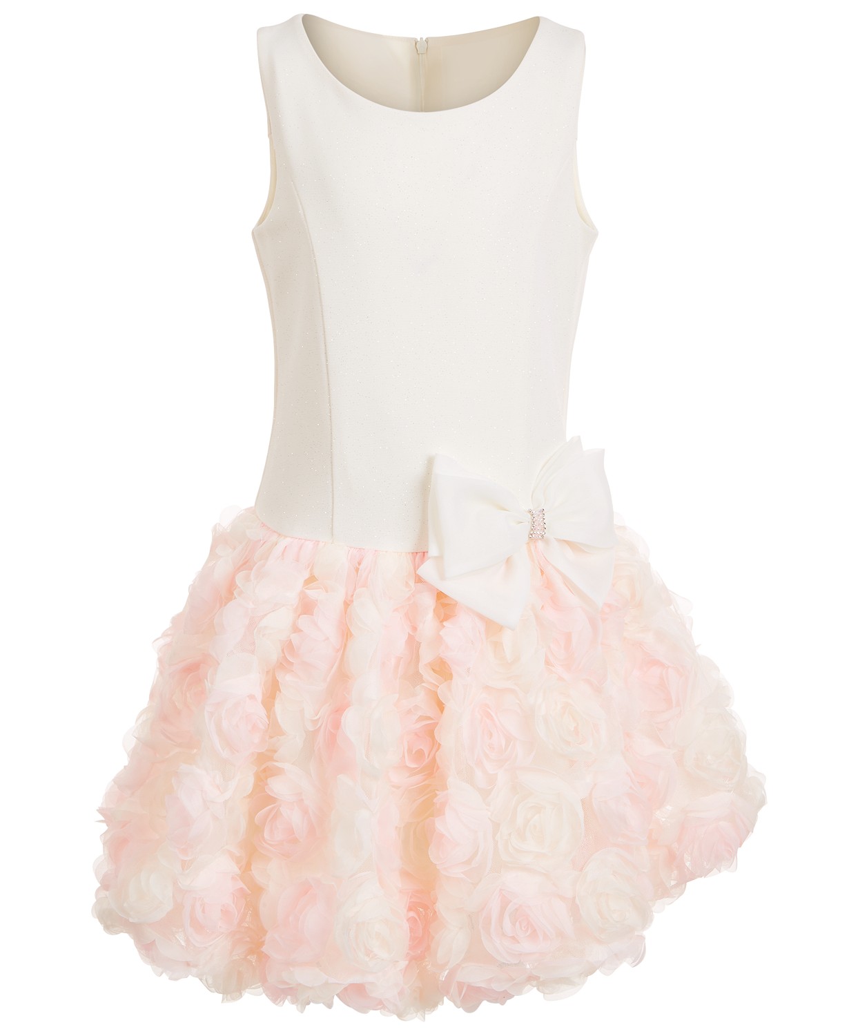 Color: Pink; Size: 14; Approx. 29-1/4″ long from center back neck to hem. Length is based on a size 10; Crewneck; back zipper closure; Sparkle knit bodice; organza bow at drop waist; rosette bubble skirt; Bodice: polyester/spandex; skirt, lining, bow, netting: polyester; Hand wash; Imported