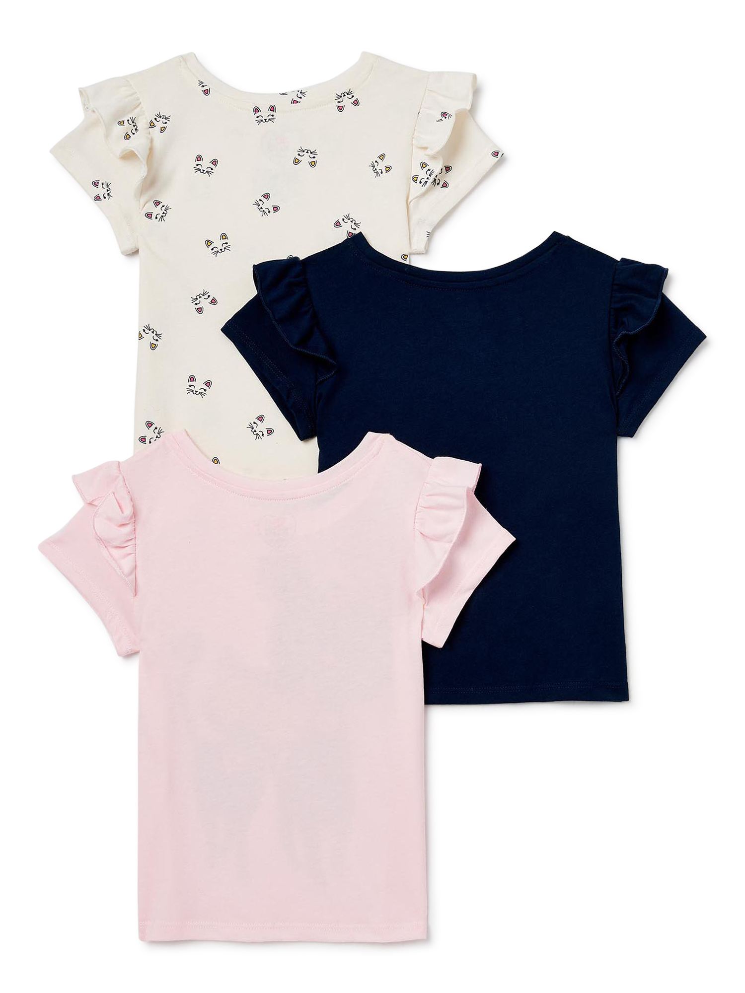 Includes 3 short sleeve graphic & printed tees with ruffle shoulder